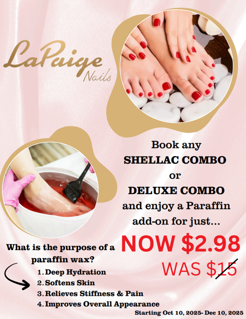 Valid on all Shellac Combo or Deluxe Combo bookingsPamper yourself with our ❤️luxurious $2.98 PARAFFIN TREATMENT!❤️ (Valid until December 10, 2025)
