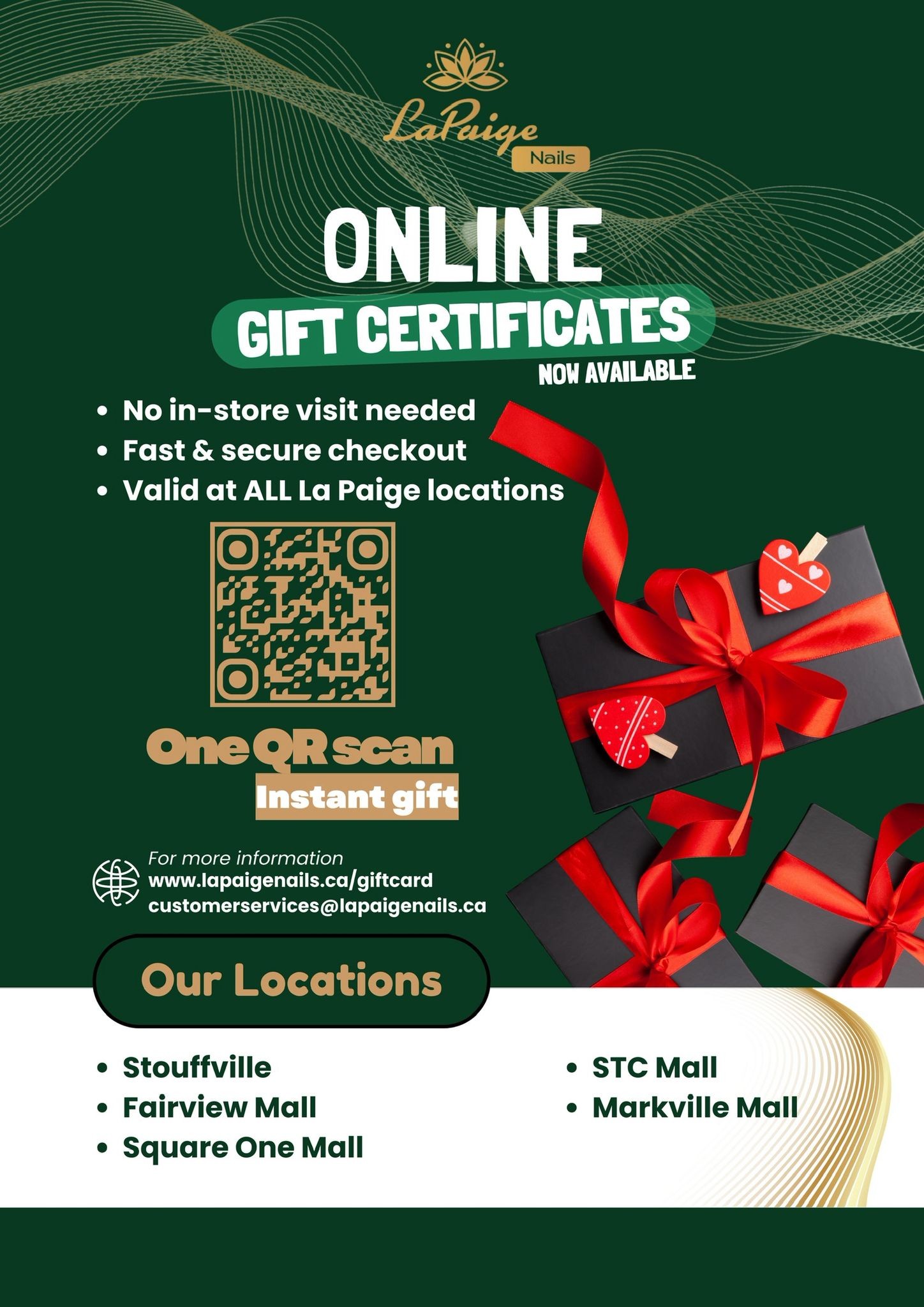 Visit us at: https://lapaigenails.ca/giftcard or Scan the QR code to buy our gift Certificates